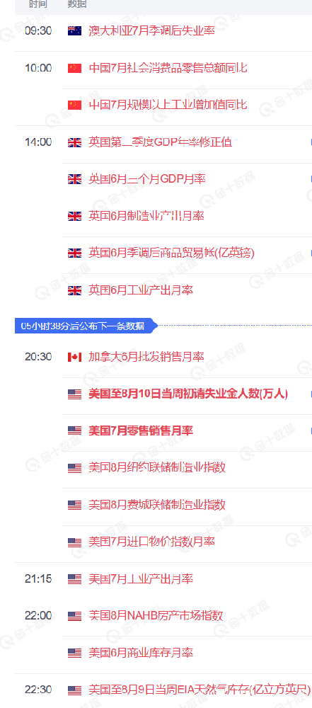 美国零售销售月率今晚8.30发布,同时发布的还有加拿大6月批发销售月率,美国至8月10日当周初请失业金人数(万人),美国8月纽约联储制造业指数,美国8月费城联储制造业指数,美国7月进口物价指数月率.